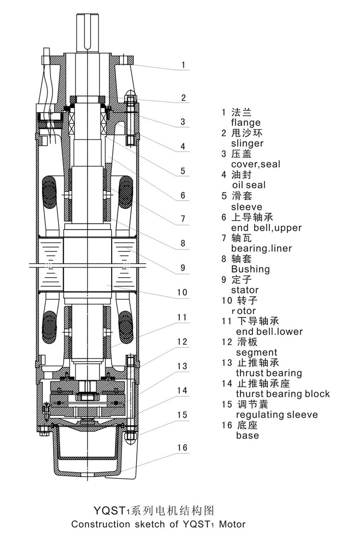 概述 YQST系列大容量潛水三相異步電動機(jī)是應(yīng)國際市場需要,在小井徑中發(fā)展大容量電機(jī)而專門開發(fā)的一種新型潛水電機(jī),他特別適用于高揚程潛水泵配套提取地下水,為城市工礦企業(yè)、農(nóng)業(yè)灌溉及居民生活提供生產(chǎn)和生活用水。本產(chǎn)品除具備一般井用潛水電機(jī)特點外,還具有單機(jī)容量大,力能指標(biāo)高,承受軸向力大,密封性能好等特點。為了適應(yīng)用花需要,電機(jī)機(jī)殼可采用不銹鋼材料,但需在合同中注明。 型號說明