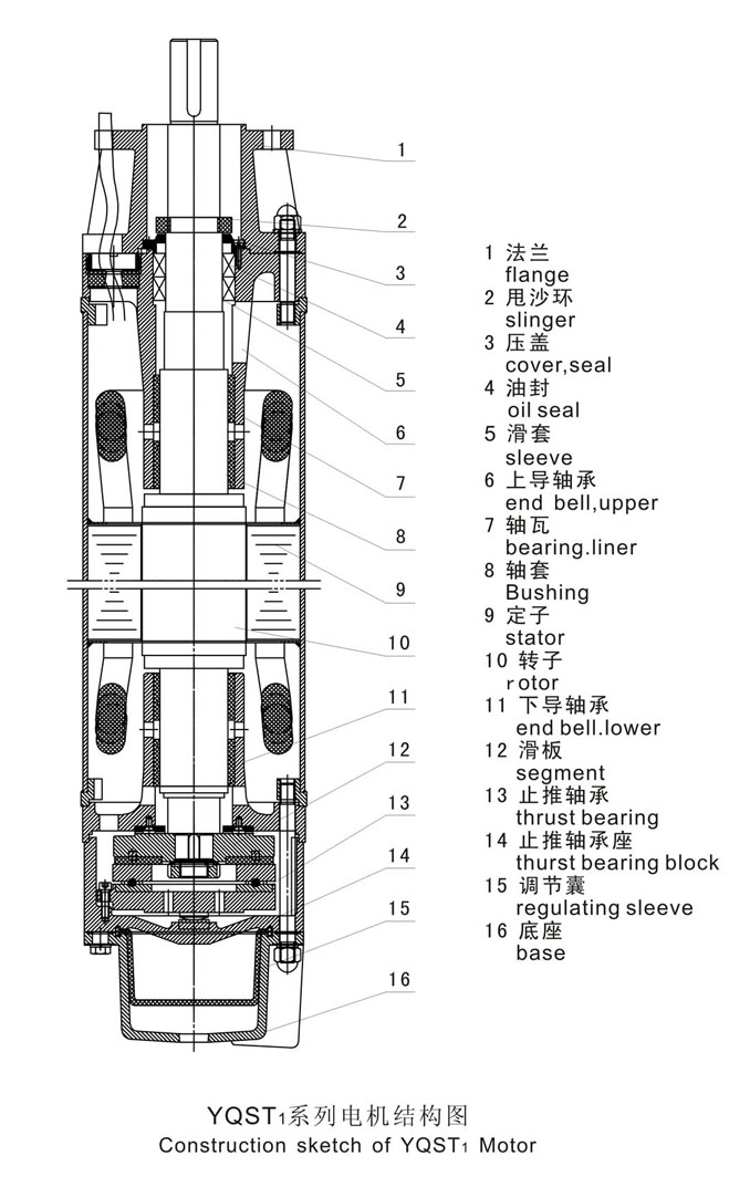 概述 YQST系列大容量潛水三相異步電動(dòng)機(jī)是應(yīng)國(guó)際市場(chǎng)需要,在小井徑中發(fā)展大容量電機(jī)而專(zhuān)門(mén)開(kāi)發(fā)的一種新型潛水電機(jī),他特別適用于高揚(yáng)程潛水泵配套提取地下水,為城市工礦企業(yè)、農(nóng)業(yè)灌溉及居民生活提供生產(chǎn)和生活用水。本產(chǎn)品除具備一般井用潛水電機(jī)特點(diǎn)外,還具有單機(jī)容量大,力能指標(biāo)高,承受軸向力大,密封性能好等特點(diǎn)。為了適應(yīng)用花需要,電機(jī)機(jī)殼可采用不銹鋼材料,但需在合同中注明。 型號(hào)說(shuō)明