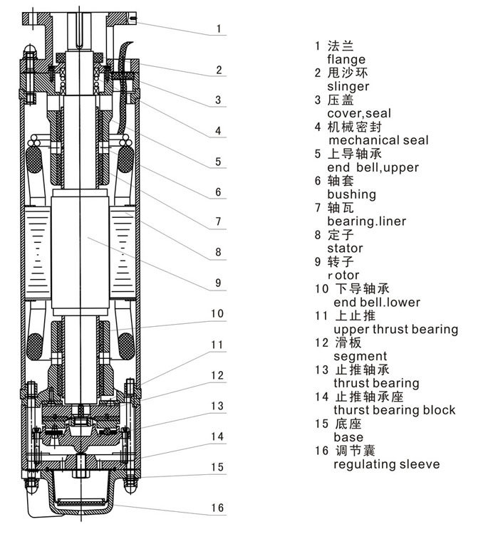 注:高推力型軸承需特殊訂貨,采用高推力型軸承的電機(jī)性能由用戶與制造廠協(xié)議。適用條件 1、電動機(jī)應(yīng)完全潛入水中立式(或臥式適用),其潛入深度不大于70m,但不小于20m,最底位置距井底不少于5m(臥式使用時(shí)水位應(yīng)高于潛水電機(jī)1m以上)。 2、介質(zhì)水溫不高于20℃。 3、水中固體雜質(zhì)含量(重量比)不超過0.01%。 4、水中氯離子含量不得超過400mg/L; 5、水中硫化氫含量不得大于1.5mg/L; 6、介質(zhì)水中不含腐蝕性物質(zhì),PH值在6.5-8.5范圍內(nèi)。 7、電機(jī)運(yùn)行時(shí)內(nèi)部應(yīng)充滿潔凈的清水(可加防凍液)。 設(shè)備特點(diǎn) ★ 電機(jī)防護(hù)等級:IPX8,絕緣等級為F; ★ 充水式潛水電動機(jī)結(jié)構(gòu)簡單,定轉(zhuǎn)子繞組和鐵心直接浸在水中,冷卻效果好、輸出功率大、效率較高。 ★ 由于充水式潛水電動機(jī)內(nèi)腔所充多為清水,使用過程中產(chǎn)生的滲漏對所安裝使用井水水質(zhì)不會產(chǎn)生污染。 ★ 充水式潛水電動機(jī)的定子繞組。鐵心很軸承均在水中工作,對定子繞組所使用上網(wǎng)導(dǎo)線及其加工工藝、接頭材料及包扎工藝、水潤滑軸承的結(jié)構(gòu)、材料及加工工藝、鐵心與金屬材料的防銹防腐蝕處理等有很高的要求。 電動機(jī)結(jié)構(gòu) 1、 潛水電機(jī)由定子、轉(zhuǎn)子、上下導(dǎo)軸承、下連接法蘭、底座、軸伸密封裝置等組成。 2、 潛水電機(jī)各止口連接處采用密封圈密封;軸伸密封根據(jù)水質(zhì)含砂量多少,選擇不同方式的密封裝置。(含砂量大于0.01%時(shí)采用橡膠骨架油封;含砂量大于0.01-0.5%時(shí)采用機(jī)械密封) 3、 電動機(jī)下部裝有橡膠調(diào)節(jié)囊,其作用為當(dāng)電機(jī)內(nèi)部熱脹冷縮時(shí)及電機(jī)外部水位高低變化時(shí),用以平衡電機(jī)內(nèi)腔與水的壓力。 4、 電動機(jī)定子繞組采用耐水絕緣線,有良好的絕緣能力,繞組線與耐水JHS型電纜連接。 5、 潛水電機(jī)上、下導(dǎo)軸承座內(nèi)裝有軸瓦,轉(zhuǎn)子下部裝有止推軸承。止推軸承由上、下止推軸承及滑板組成,用于承擔(dān)軸向力。 技術(shù)支持 1、保證電機(jī)的引出電纜處端電壓為380(1±5%)V,頻率為50(1±1%)HZ(其它電壓或頻率須特殊訂貨)。 2、電機(jī)的******運(yùn)行電流不得大于銘牌上的標(biāo)定值(即額定電流,配套廠家和用戶在選用和調(diào)試潛水電泵機(jī)組的電源控制設(shè)備時(shí),應(yīng)特別注意); 3、電機(jī)應(yīng)選用合適的控制方式(可實(shí)現(xiàn)電機(jī)的過載、欠壓、斷相運(yùn)行的保護(hù)并可根據(jù)水位自動控制電泵的起停); 4、電機(jī)為連續(xù)工作制(S1)。兩次起動時(shí)間間隔不得小于10分鐘; 5、電機(jī)應(yīng)可豎直使用,也可臥式使用(須特殊訂制); 6、用于水池或超過規(guī)定的井徑中時(shí)應(yīng)加裝吸水罩,使電機(jī)表面的水流速度達(dá)到0.5-1m/s,以保證電機(jī)良好的散熱。吸水罩應(yīng)將電動機(jī)和第一,二級泵包括在內(nèi)。 供貨范圍 潛水電機(jī)主機(jī)(包括3米引纜),電纜的接頭絕緣粘帶(包括優(yōu)質(zhì)聚氯乙烯粘帶、自熔乙丙膠帶、丁基橡膠自粘帶)使用維護(hù)說明書1份,合格證1份裝箱單1份,木箱包裝。 注:當(dāng)環(huán)境水或電網(wǎng)電壓、頻率不符合上述規(guī)定時(shí),用戶可以提出要求,本公司提供訂制適用產(chǎn)品。